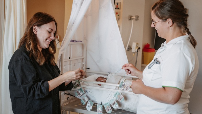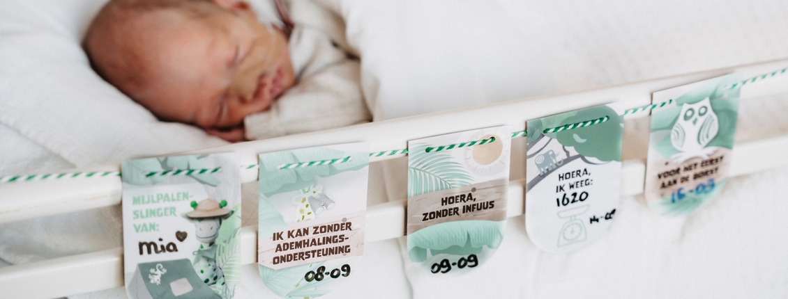 Daarom hebben we kleurrijke slingers ontworpen van de mijlpalen van deze kindjes tijdens hun verblijf in het ziekenhuis. Denk aan bijzondere stappen zoals “Ik mag de couveuse uit”, “Papa en mama geven zelf sondevoeding” of “Ik kan zonder ademhalingsondersteuning”. Elke keer wanneer zij zo'n mijlpaal bereiken, wordt het kaartje toegevoegd aan de slinger. Ook wordt de datum erbij gezet.